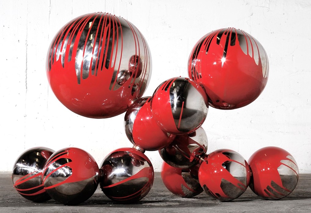 Daneben seine außergewöhnlichen und inzwischen weltweit beachteten Atompops: Arbeiten aus polierten, silbern glänzenden Edelstahlkugeln.